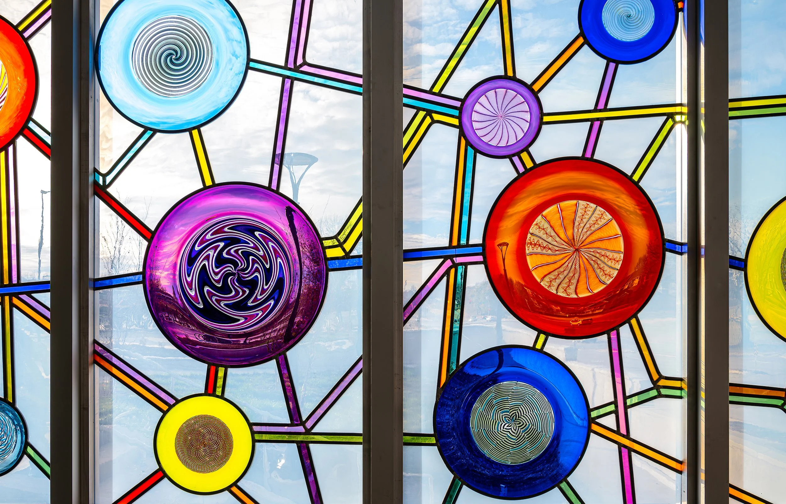Creating blown glass elements for use in leaded panels, historic sashes, or for creative uses outside the traditional; the rondels, mouth-blown sheet glass, and bullseye panes made in the Monarch hotshop are all made with the utmost care.