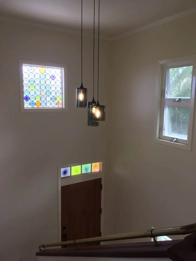 A window, transom, and pendant light trio made for an entry stairwell of a private residence in Hilo, Hawaii; 2019.