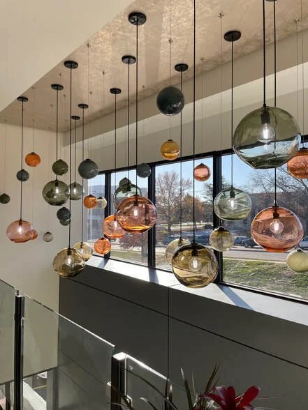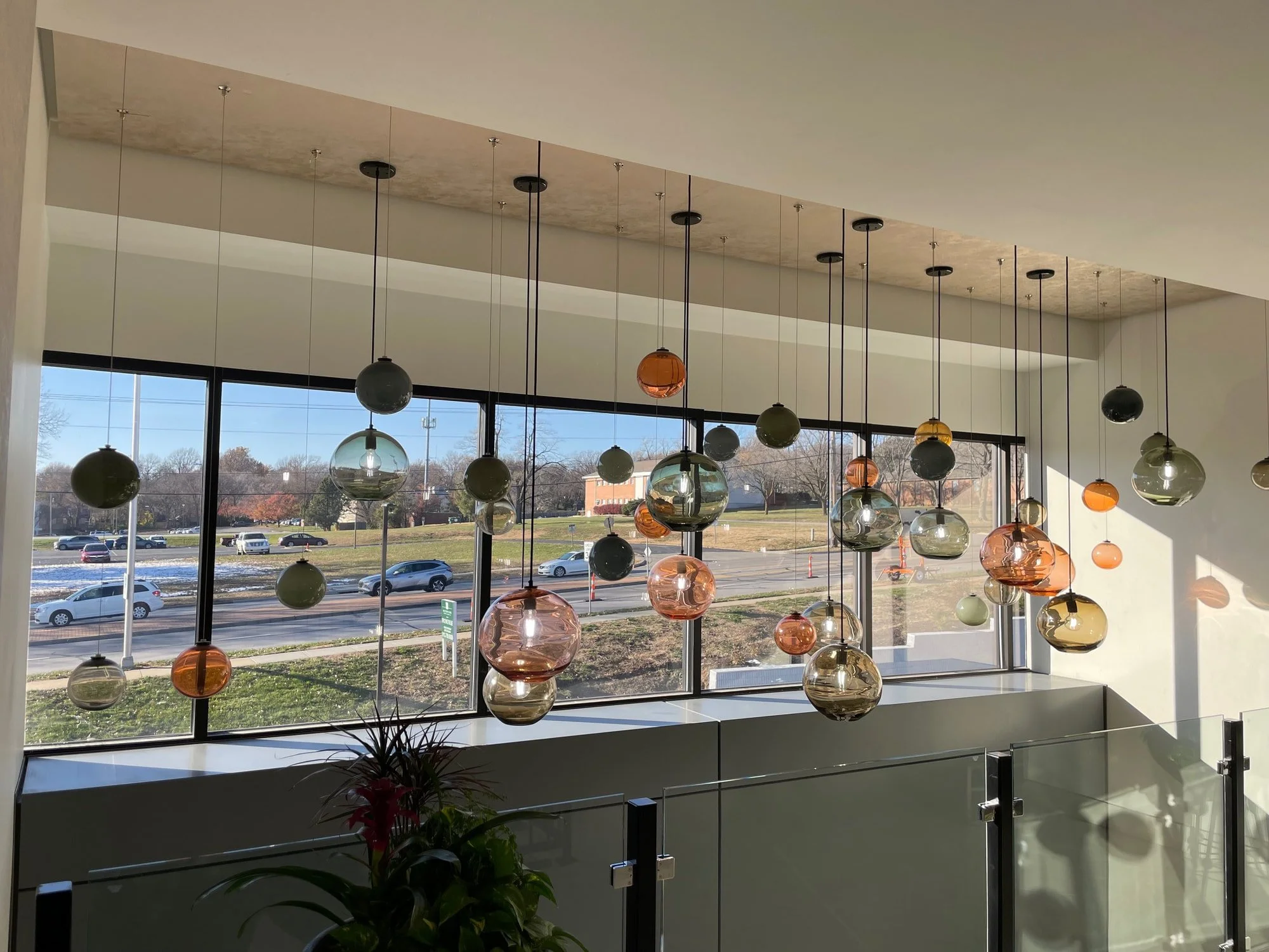 Suspended 6" satellites alongside 13" globe pendants installed into the front entrance of an office building in Overland Park, Kansas. 2023.