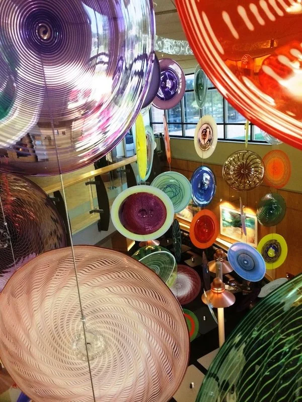 Utilizing natural light to enhance the color within blown glass and spread secondary splashes of color throughout an environment is an amazing use of lofted ceilings of open air. Monarch Glass Studio loves when a suspended work option is presented for it will mean a full capture of light and color. Using slip-proof hardware and stainless airline cable, the suspended work is sure to stay suspended as well.