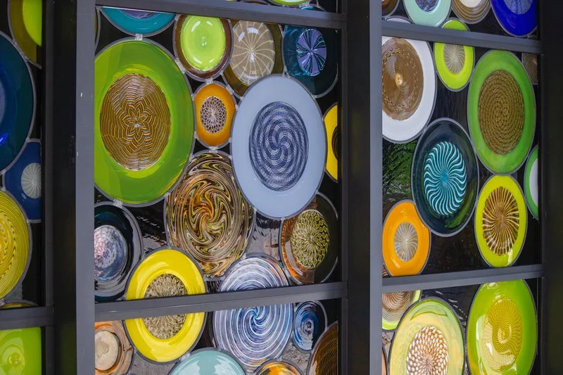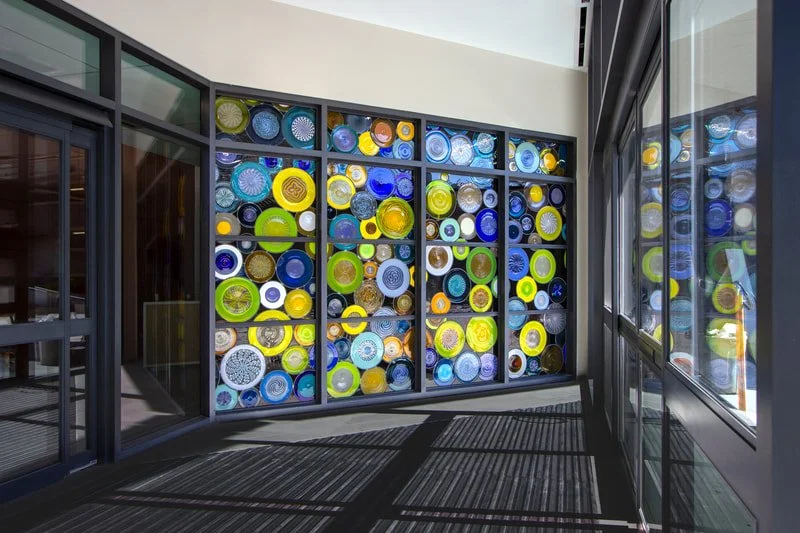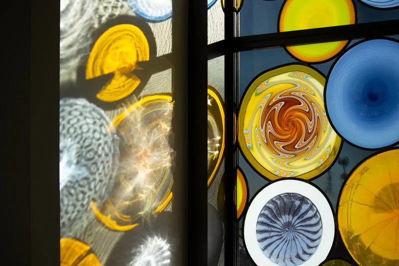 "Making Connections" used over one hundred sheets of specifically blown cylinders and 36 unique blown rondels to make up its windows. Installed as part of a larger installation around the campus of the Lawrence Transit Facility in Lawrence, Kansas, 2023.