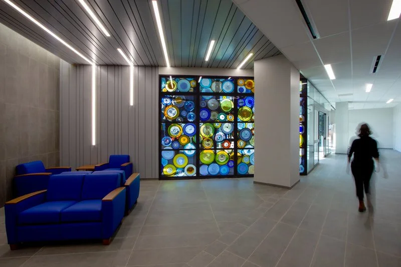 "Cellular" 470 square feet of blown glass stained glass windows, built with reinforced lead came. Installed at the University Health Center, in Kansas City, Missouri, in 2020.